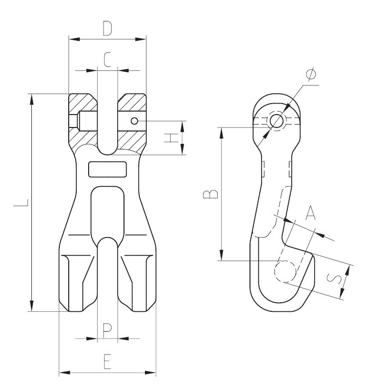 | ITEM NO. | WEIGHT (kg) | WLL (T) | B.L (T) | A±0.3 | B±2 | C±0.5 | D±1 | E±2 | H±1 | L±2 | Φ±0.5 | P±0.5 | S±0.3 |